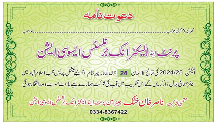 تفصیلات کے مطابق پرنٹ اینڈ الیکٹرانک جرنلسٹس ایسوسی ایشن کے سالانہ انتخابی نتائج کا اعلان مورخہ 24 جون بروز پیر شام 6 بجے نیشنل پریس کلب اسلام آباد میں سینئر صحافی چیئرمین الیکشن کمیٹی بلال ڈار کریں گے۔