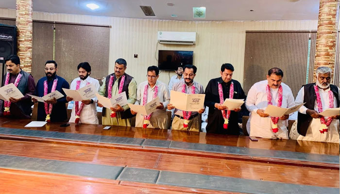 حافظ آباد(شوکت علی وٹو )ڈسٹرکٹ پریس کلب یونین آف جرنلسٹس حافظ آباد کی نومنتخب کابینہ کی تقریبِ حلف برداری مقامی ہال میں پروقار طریقے سے منعقد ہوئی۔نومنتخب کابینہ میں، چئیرمین، بابر اعجاز صدیقی، صدر، گلزار حسین چوہان، سینئر وائس چیئرمین میاں مظہر حیات، وائس چیئرمین، مہر فاروق احسان، نائب صدر، شہزاد امین بھٹی، جنرل سیکرٹری، شیخ زاہد سہیل، جائنٹ سیکرٹری، اسرار حسین شاہ، فنانس سیکرٹری، امیر حمزہ مغل، انفارمیشن سیکرٹری، حماد حسین سیالوی، آفس سیکرٹری، قاضی شیر علی ہیں تقریب کے مہمانِ خصوصی صدر پاکستان فیڈرل یونین آف جرنلسٹ (PFUJ) افضل بٹ صغیر چودھری اور میاں شاہد سمیت صحافتی تنظیموں کے دیگر مرکزی قائدین نے بھی شرکت کی، تقریب میں سابق ایم پی میاں مامون جعفر تارڑ، مبشرعزیز گجر صدر ڈسٹرکٹ بار حافظ آباد، پیر سید عطاءالحسنین شاہ نقوی، علامہ پیر غلام مصطفیٰ سلطانی، صابر حسین گجر منہاج القرآن،مختلف تنظیموں وابستہ افراد سمیت مختلف شعبہ جات سے وابستہ افراد کی شرکت نے تقریب کو چار چاند لگا دیے ۔مہمانوں کا ڈھول کی تھاپ پر شاندار استقبال کیا گیا مہمانان گرامی کو پھولوں کے ہار پہنائے گے، تقریب کا آغاز انتہائی جوش و خروش سے ہوا۔صحافی برادری نے مہمانان گرامی پر پھولوں کی پتیاں نچھاور کیں۔ اس موقع پر فضا “صحافت زندہ باد” کے نعروں سے گونج اٹھی۔تقریب کے دوسرے مرحلے میں صدر پی ایف یو جے افضل بٹ نے ڈسٹرکٹ پریس کلب حافظ آباد کی نومنتخب کابینہ سے ان کے عہدوں کا حلف لیا۔ حلف اٹھانے والے عہدیداران نے اس عزم کا اعادہ کیا کہ وہ صحافتی اخلاقیات کی پاسداری کرتے ہوئے مظلوم طبقے کی آواز بنیں گے اور ضلع میں صحافت کے معیار کو بلند کرنے کے لیے اپنی تمام تر توانائیاں صرف کریں گے۔آزادیِ اظہارِ رائے پر زور تقریب سے خطاب کرتے ہوئے صدر پی ایف یو جے افضل بٹ نے کہا کہ صحافت ریاست کا چوتھا ستون ہے اور اس کی آزادی براہِ راست جمہوریت کی مضبوطی سے جڑی ہوئی ہے۔ انہوں نے “آزادیِ اظہارِ رائے” کی اہمیت پر زور دیتے ہوئے کہا، صحافی برادری نے ہمیشہ کڑے وقت میں سچ کا ساتھ دیا ہے۔ ہم آزادیِ رائے پر کسی قسم کا سمجھوتہ نہیں کریں گے۔ حافظ آباد کی صحافی برادری کا اتحاد اس بات کی علامت ہے کہ سچائی کی آواز کو دبایا نہیں جا سکتا۔انہوں نے نومنتخب کابینہ کو مبارکباد دی اور امید ظاہر کی کہ وہ کارکن صحافیوں کے حقوق کے تحفظ کے لیے ہراول دستے کا کردار ادا کریں گےتقریب کے اختتام پر ڈسٹرکٹ پریس کلب یونین آف جرنلسٹ حافظ آباد کی جانب سے تمام معزز مہمانوں کا تہہ دل سے شکریہ ادا کیا گیا۔ مقامی صحافتی برادری نے افضل بٹ، صغیر چودھری اور میاں شاہد کی آمد کو حافظ آباد کے صحافیوں کے لیے باعثِ فخر قرار دیا۔