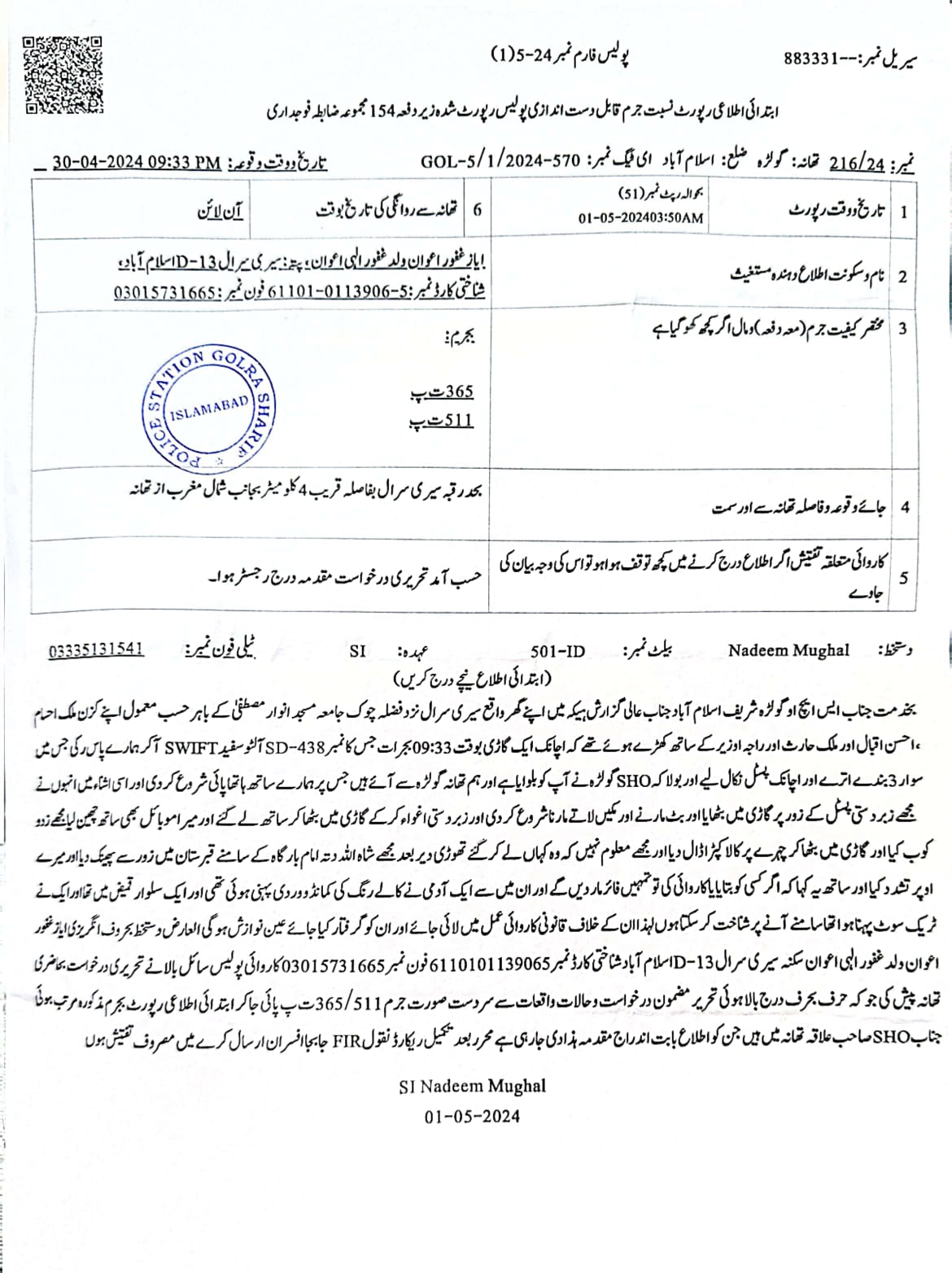 تھانہ گولڑہ کے علاقے موضع سری سرال کے 17 سالہ رہائشی ایاز غفور اعوان کے مطابق اسے منگل اور بدھ کی درمیانی شب وہ اپنے کزن کے ہمراہ کھڑا تھا کہ اچانک انکے قریب ایک سفید رنگ کی گاڑی نمبر SD.438 آکر رکی جس میں لوگ سوار تھے ان میں سے ایک نوجوان نے اسلام آباد پولیس کی وردی پہن رکھی تھی جس نے مجھے کیا کہ تھانہ گولڑہ چلو ایس ایچ او بلا رہا ہے جب جانے سے انکار کیا تو اس اہلکار نے پسٹل نکال لیا اور تشدد کرتے ہوئے اپنے ساتھیوں کی مدد سے زبردستی گاڑی میں ڈال لیا اور آنکھوں پر سیاہ پٹی باندھ دی اور میرا موبائل بھی چھین لیا اسی اثنا میں وہاں پر موجود میرے کزن نے میرے والد کو اطلاع کی جب والد نے میرے نمبر کال رابطہ کیا تو اسی پولیس والے نے کال پک کرتے کہا کہ آپکا بیٹا اب میری تحویل میں ہے اور اس نے اپنا تعارف حیدر عباس اہلکار سی آئی اے پولیس بتایا اور دھمکی دی کہ اسے زندہ نہیں چھوڑیں گے ۔ والد نے صورت حال کی سنگینی کے پیش نظر فوری طور پر ریسکیو 15 پر اطلاع کی جس پر یہ اہلکار اپنے ساتھیوں کے ہمراہ مجھے ویرانے میں پھینک کر چلے گئے ۔