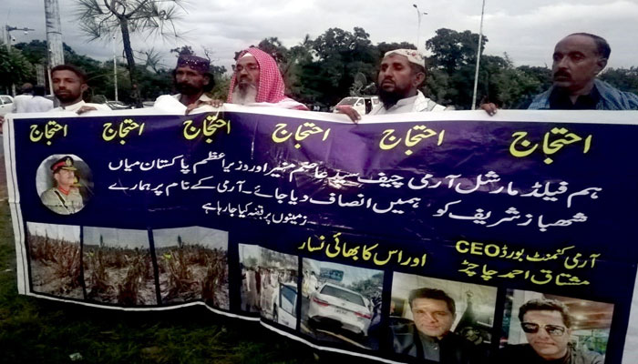 اسلام آباد(روشن پاکستان نیوز) گھوٹکی کے رہائشیوں امام دین کلہوڑو، مولوی امداد اللّٰہ کلہوڑو ،قربان عبد الروف، عبدالحفیظ نے اپنی زمین پر قبضہ کئے جانے کے خلاف نیشنل پریس کلب کے سامنے احتجاجی مظاہرہ کیا ،مظاہرین کا کہنا تھا کہ کنٹونمنٹ حیدر آباد کے CEO مشتاق احمد اور ان کے بھائی نثار احمد نے ہماری 48 ایکڑ جدی جائیداد پر ناجائز قبضہ کر لیاہے اورہماری زمینوں پر لوگ لا کر ہماری کیلے کی فصل تباہ کردی ہے جس سے ہمارا لاکھوں کا نقصان ہوا ہے، ہم مجبور ہو کر آج اسلام آباد آئے ہیں تاکہ ہماری آواز کو حکام بالا تک پہنچایا جائے، انہوں نے چیف آف آرمی سٹاف،صدر پاکستان، وزیر اعظم پاکستان اور دیگر ذمہ داران سے مطالبہ کیا ہے کہ فوری طور پر نوٹس لے کر ہمیں انصاف فراہم کیا جائے بصورت دیگر ہم پارلیمنٹ کئے سامنے پُرامن بھوک ہڑتال کرنے پر مجبور ہونگے۔