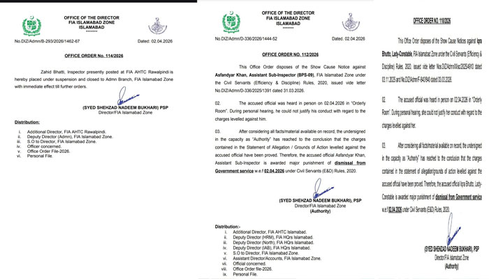 تفصیلات کے مطابق لیڈی کانسٹیبل اقراء اور اے ایس آئی اسفند یار کو ملازمت سے برخاست (ڈسمس فرام سروس) کر دیا گیا، جبکہ انسپکٹر زاہد بھٹی اور سب انسپکٹر حسن علی کو معطل کر دیا گیا ہے۔ معطل افسران کو ایف آئی اے کی ایڈمن برانچ میں رپورٹ کرنے کی ہدایت بھی جاری کی گئی ہے۔