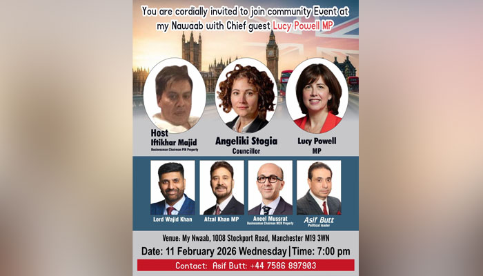 مانچسٹر (روشن پاکستان نیوز): مانچسٹر کے معروف مقام مای نواب میں آج 11 فروری 2026 بروز بدھ ایک اہم کمیونٹی ایونٹ کا انعقاد کیا جا رہا ہے، جس میں برطانوی رکنِ پارلیمنٹ لوسی پاول ایم پی بطور مہمانِ خصوصی شرکت کریں گی۔ اس تقریب کی میزبانی معروف کاروباری شخصیت اور چیئرمین پن پراپرٹی افتخار مجید کر رہے ہیں۔