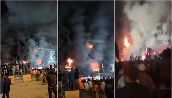 کئی گھنٹے گزرنے کے بعد بھی آگ پر قابو نہیں پایا جا سکا ہے۔ رات سوا 10 بجے کے قریب گل پلازہ کے گراؤنڈ فلور پر آگ لگی جو دیکھتے ہی دیکھتے تیسری منزل تک پہنچ گئی۔