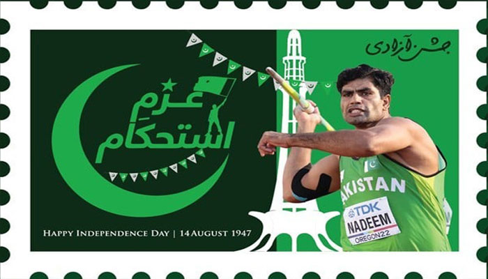 ڈاک ٹکٹ پر پاکستان کے جیولین تھرور ارشد ندیم کی تصویر لگا کر انہیں خراج تحسین پیش کیا گیا ہے ، ارشد ندیم نے پیرس اولمپکس میں 92.97 میٹر فاصلے پر نیزہ پھینک کر نیا اولمپک ریکارڈ قائم کر کے گولڈ میڈل حاصل کیا اور نوجوان نسل کے لئے ایک مثال بن گئے ہیں۔