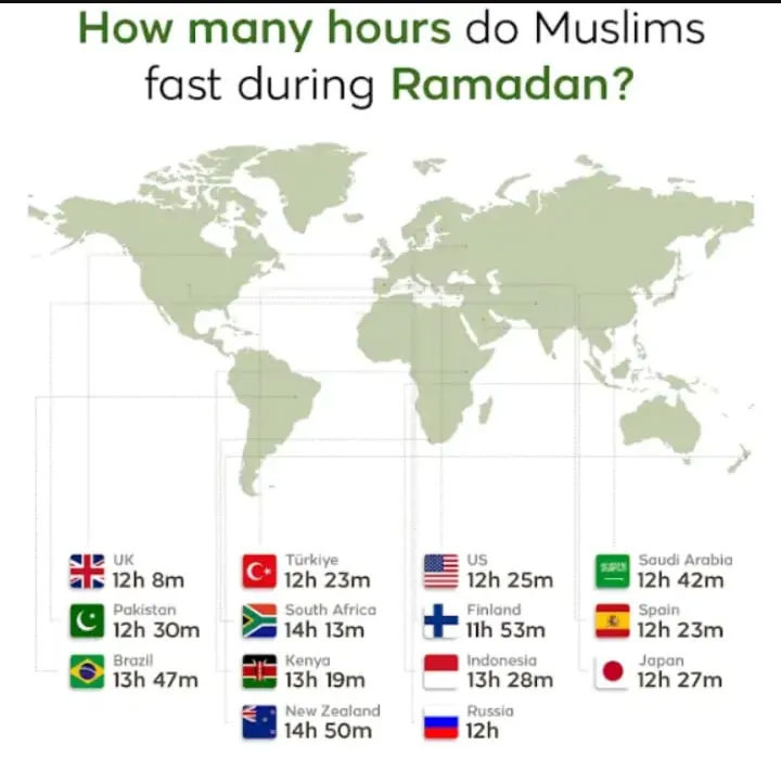 پاکستان، بھارت اور بنگلا دیش میں روزے کا دورانیہ تقریباً ساڑھے 12 سے 14 گھنٹے متوقع ہے۔ جبکہ مشرق وسطیٰ میں اوسطاً 12 سے 13 گھنٹے روزہ رکھا جائے گا۔