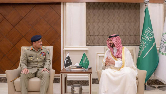 چیف آف ڈیفنس فورسز فیلڈ مارشل سید عاصم منیر اور سعودی وزیردفاع شہزادہ خالد بن سلمان کے درمیان ہونے والی ملاقات میں دونوں رہنماؤں نے سعودی عرب پر ایرانی حملوں سمیت پاک سعودی دفاعی معاہدے اور اسٹرٹیجک تعاون کے تحت حملوں کو روکنے کے اقدامات پر تبادلہ خیال کیا ۔