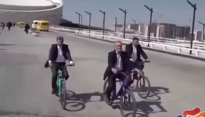 میڈیا رپورٹس اور سوشل میڈیا ویڈیوز کے مطابق صدر پزشکیان کو سادہ انداز میں سائیکل چلاتے ہوئے سکیورٹی اہلکاروں کے ہمراہ شہر کی سڑکوں پر دیکھا گیا، جہاں انہوں نے متاثرہ علاقوں کا معائنہ کیا اور عوامی صورتحال کا جائزہ لیا۔